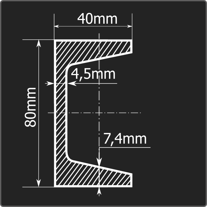 Швеллер стальной горячекатаный с уклоном внутренних граней полок 8У и длиной 12м. Материал - углеродистая сталь. Соответствует требованиям ГОСТ 535-2005.