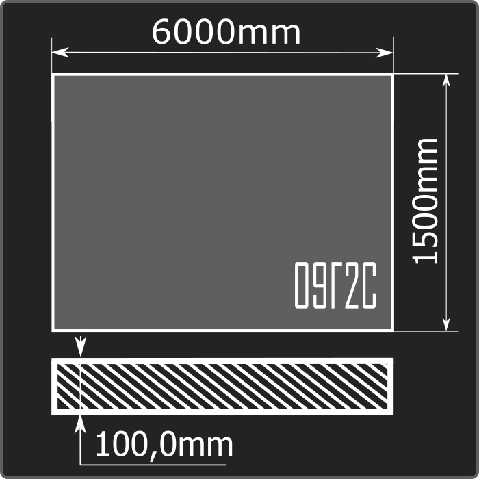 Лист стальной горячекатаный толщиной 100мм, шириной 1500мм и длиной 6000мм. Материал - низколегированная сталь. Соответствует требованиям ГОСТ 19281-2014.