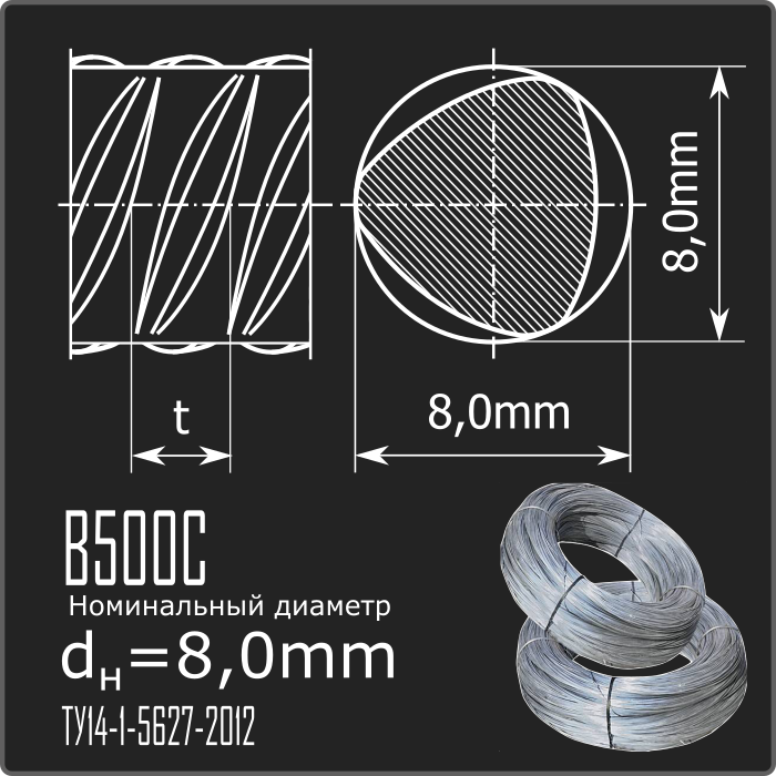 Арматурный прокат холоднодеформированный в мотках периодического профиля номинального диаметра dн 8,0мм класса В500 С (свариваемый). Соответствует требованиям ТУ14-1-5627-2012.