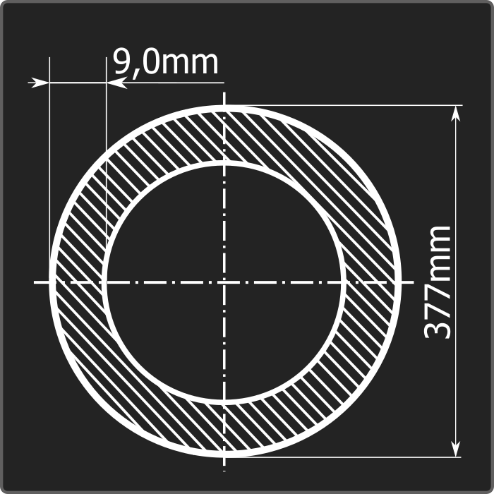 Труба электросварная стальная круглого сечения диаметром 377мм, толщиной 9,0мм и длиной 12м. Материал - углеродистая сталь. Соответствует требованиям ГОСТ 10705-80.