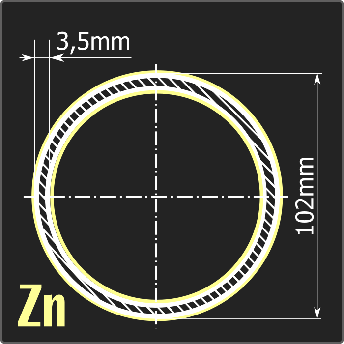Труба электросварная стальная оцинкованная диаметром 102мм, толщиной 3,5мм и длиной 12м. Тип покрытия – горячее цинкование ГОСТ 9.307-89. Материал - углеродистая сталь. Соответствует требованиям ГОСТ 10705-80.