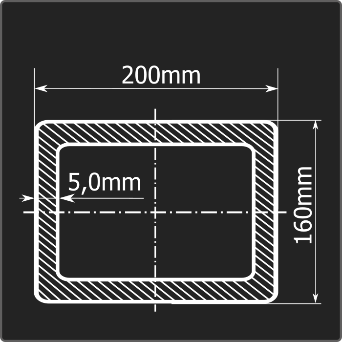 Труба профильная стальная прямоугольного сечения 200*160мм, длиной 12м и толщиной 5,0мм. Материал - углеродистая сталь. Соответствует требованиям ГОСТ 30245-2003. Стандартный пакет: вес - 2,913тн., количество - 9шт.