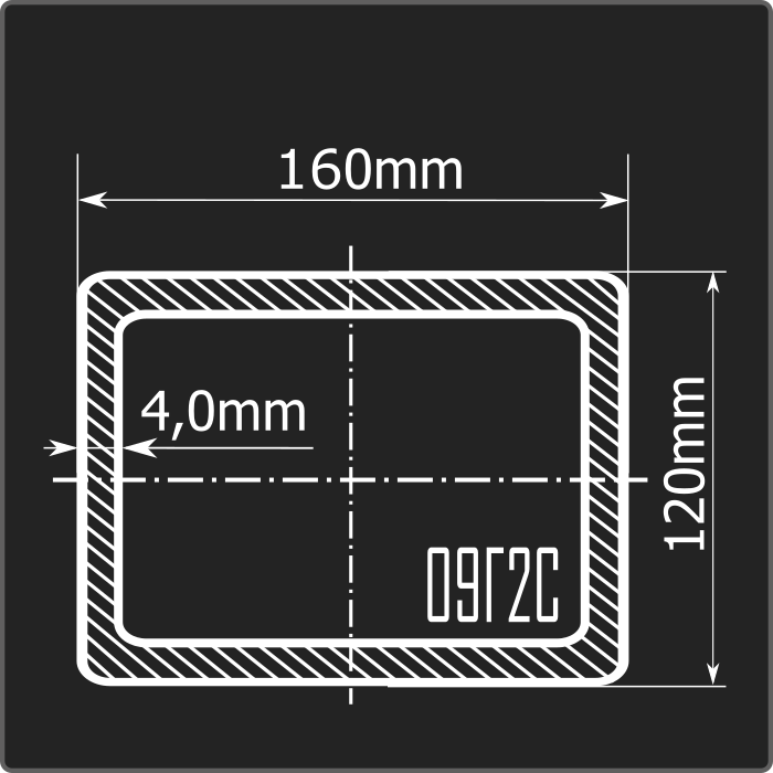 Труба профильная стальная прямоугольного сечения 160*120мм, длиной 12м и толщиной 4,0мм. Материал - низколегированная сталь. Соответствует требованиям ГОСТ 30245-2003. Стандартный пакет: вес - 4,023тн., количество - 20шт.