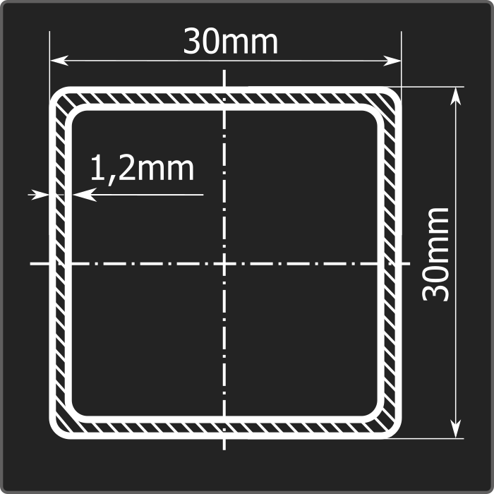 Труба профильная стальная квадратного сечения 30*30мм, длиной 6м и толщиной 1,2мм. Материал - углеродистая сталь. Соответствует требованиям ГОСТ 13663-86. Стандартный пакет: вес - 1,445тн., количество - 225шт.
